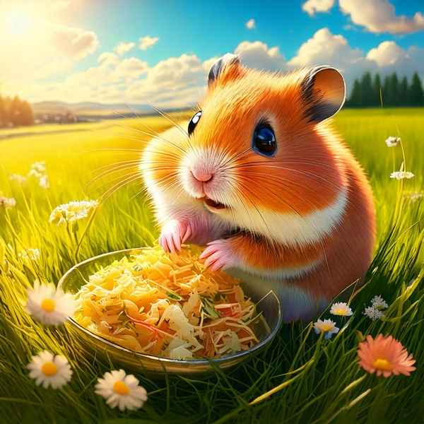 ハムスターのオズとウサギのリリーが野原でお弁当を広げています。
